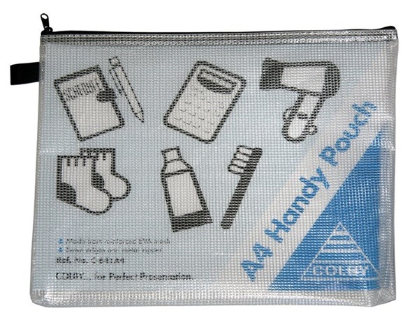 High quality A4 size zippered pouch, made from water-resistant mesh reinforced PVC, with fabric finger loop and fabric-backed metal zip.