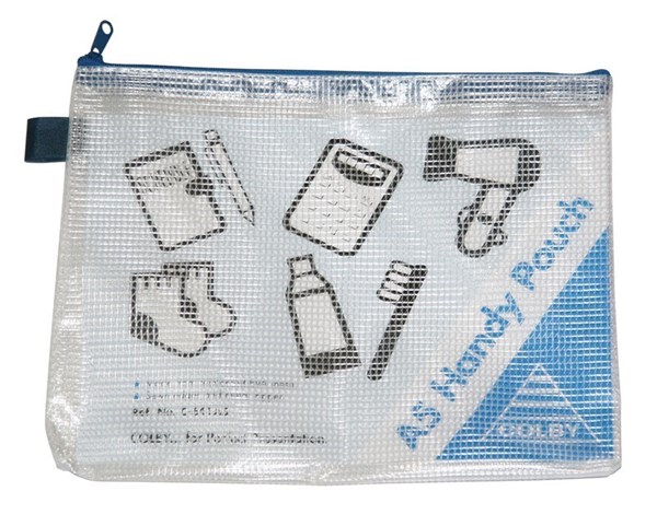 High quality A5 size zippered pouch, made from water-resistant mesh reinforced PVC, with fabric finger loop and fabric-backed metal zip.