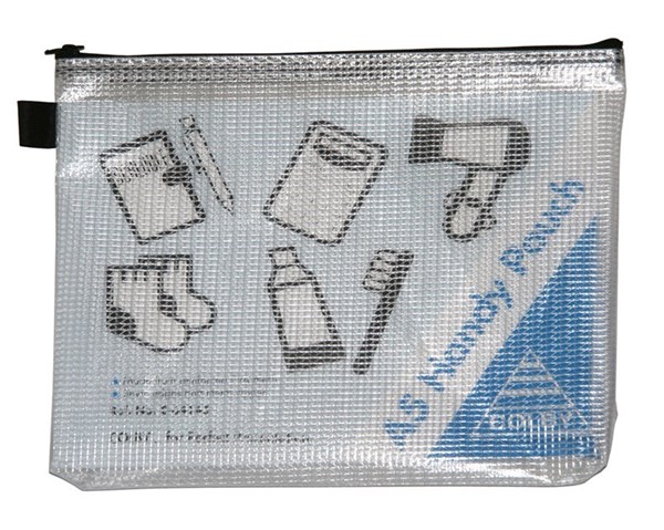 High quality A5 size zippered pouch, made from water-resistant mesh reinforced PVC, with fabric finger loop and fabric-backed metal zip.