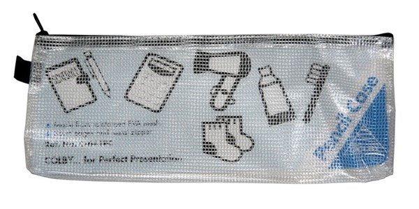 High quality 135mm x 330mm (pencil case size) zippered pouch, made from water-resistant mesh reinforced PVC, with fabric finger loop and fabric-backed metal zip.