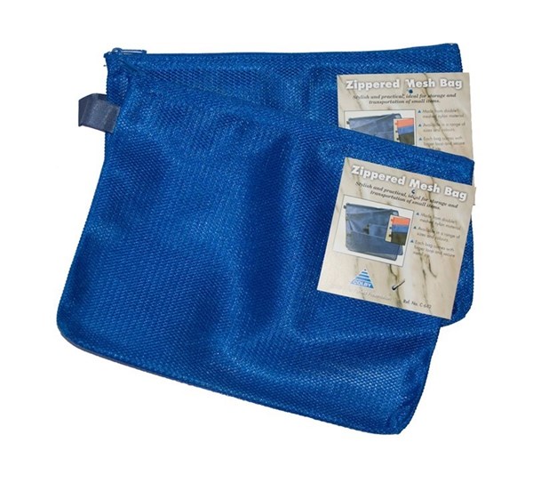 High quality A5 storage pouches made from double nylon mesh with fabric finger loop and fabric-backed metal zips.