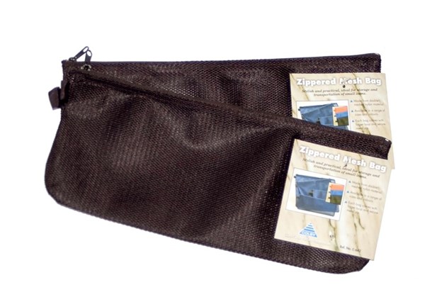 High quality 135mm x 330mm (pencil case size) storage pouches made from double nylon mesh with fabric finger loop and fabric-backed metal zips.