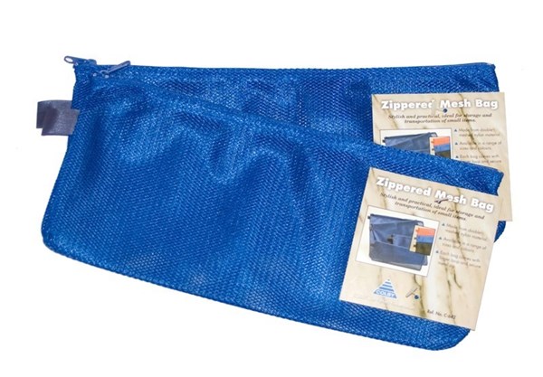 High quality 135mm x 330mm (pencil case size) storage pouches made from double nylon mesh with fabric finger loop and fabric-backed metal zips.
