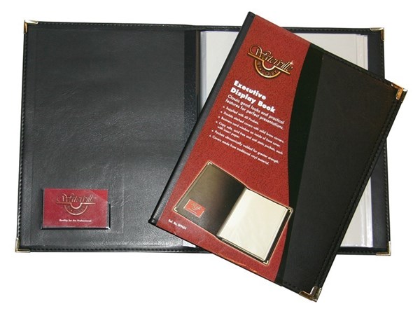 Traditional vinyl 40 page fixed pocket display book with copy safe pockets, metal corners and card window on inside of front cover.